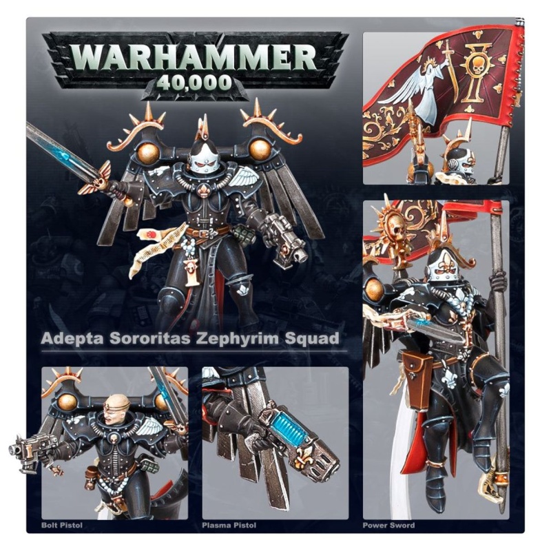The kit builds five Seraphim. The Seraphim each carry two bolt pistols, though two of their number can instead be equipped with hand flamers while two more can bear inferno pistols. One model can be assembled as a Seraphim Superior, armed with a bolt pistol or plasma pistol in one hand and a choice of bolt pistol, chainsword or power sword in the other.