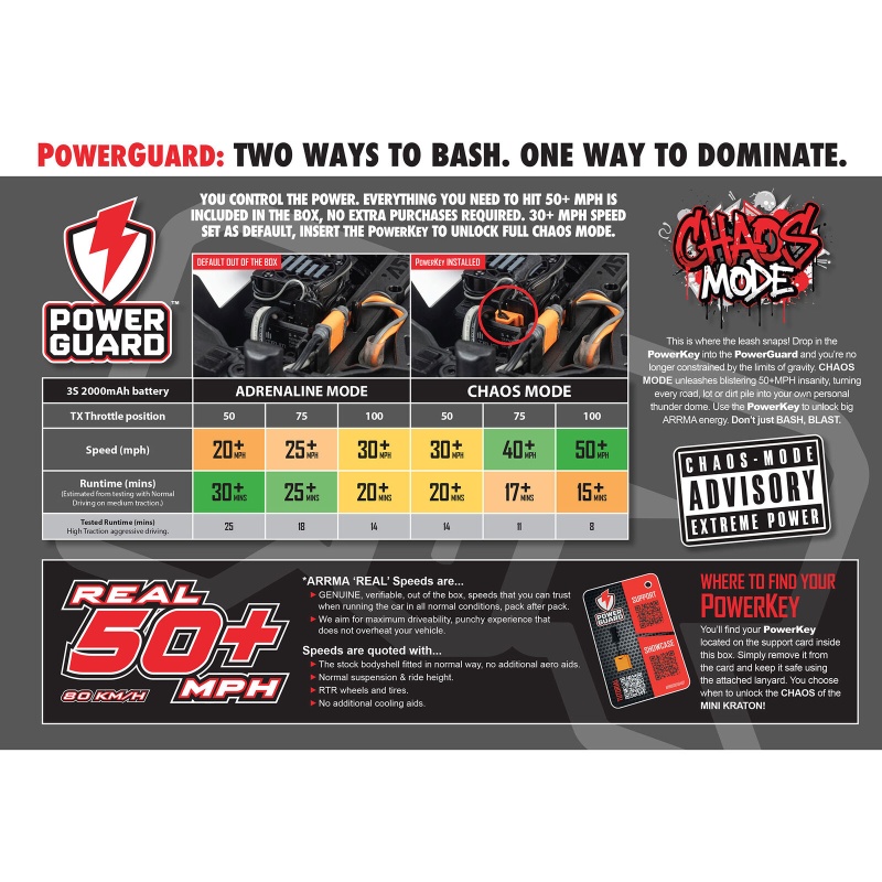 Then comes the power story that flips the script. The MINI KRATON 3S BLX is the first ARRMA vehicle equipped with PowerGuard. Right out of the box on 3S it runs at the sweet spot of 30+mph and 20mins plus runtime, great for everyone, perfect for dialling in your skills while still feeling the pulse of real brushless authority. If that's too much, flick a switch on the transmitter and open up 30mins plus of play time. When your confidence rises and your grin widens it is time for the PowerKey. Plug it in and unleash full 50+mph 3S muscle that turns this little powerhouse into pure KRATON Chaos.