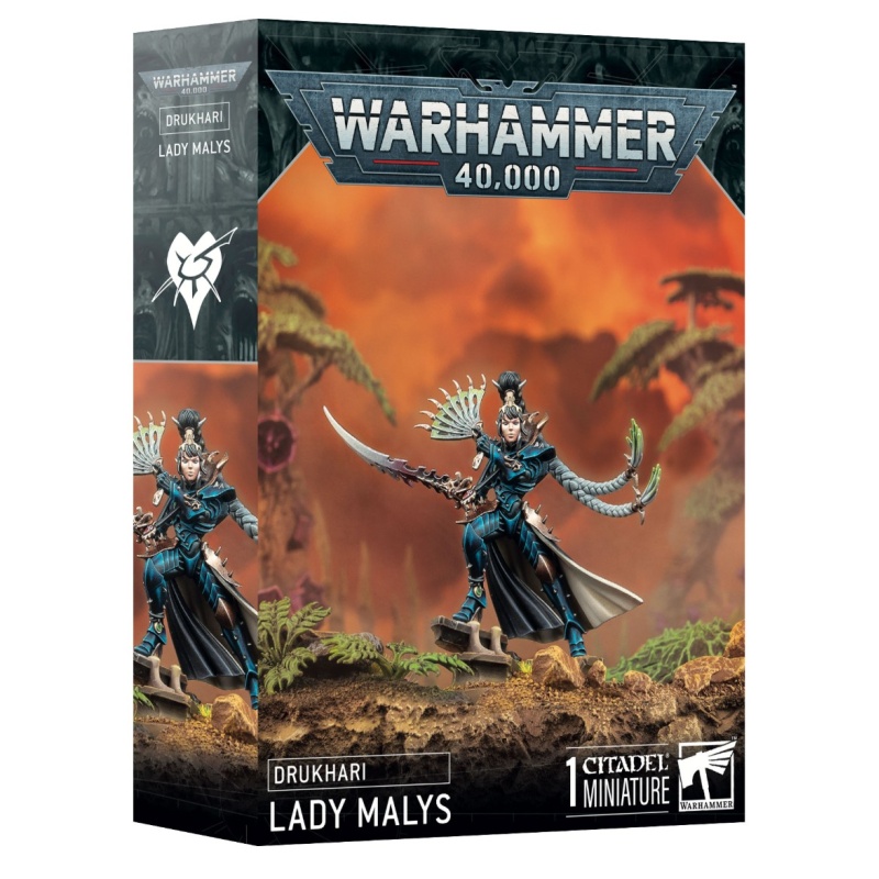 This multipart plastic kit builds Lady Malys, a powerful strategic leader for your Drukhari armies in games of Warhammer 40,000. Her tactical brilliance will give you an edge in battle. When deployed to the front lines, there is little her long blade and razor fan can't slice through in melee, unleashing a blinding flurry of blows on her hapless foes. The kit includes two different scenic base toppers and a choice of two different heads – one with a veil and one with an uncovered face, offering a degree of customisation for your expert killer.