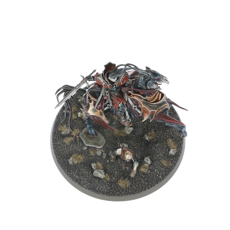 Vampire Lords on Nightmare Steeds carve gory paths through the enemy with each thundering charge. The beast’s ironshod hooves cave in chests and grind foes into the mud, while the undead cavalier astride it lays about themself with a blade or axe, opening throats with every blow.