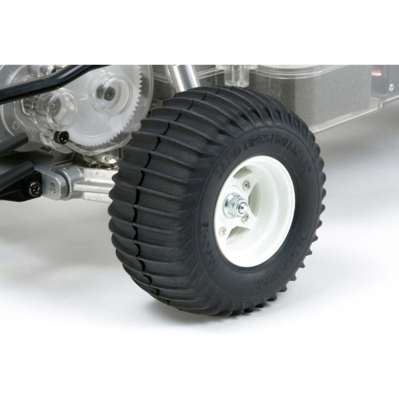 Originally released in 1979, the R/C Sand Scorcher was greatly received from fans around the world with its humorous form and superb mechanism. Keeping true to the basic layout of the original while incorporating many refined parts, this re-released version of the Sand Scorcher will remind you of the original. This model realistically reproduces the unique form of the buggy which was seen at the one-make race at the "Baja 1000" in California, USA. The body is molded in white polystyrene and can be painted with Tamiya plastic model paints. The rear-wheel drive 2WD chassis features realistic and aggressive driving performance that will no doubt excite you.