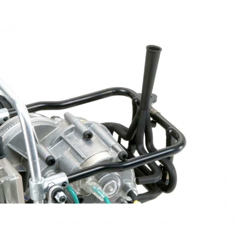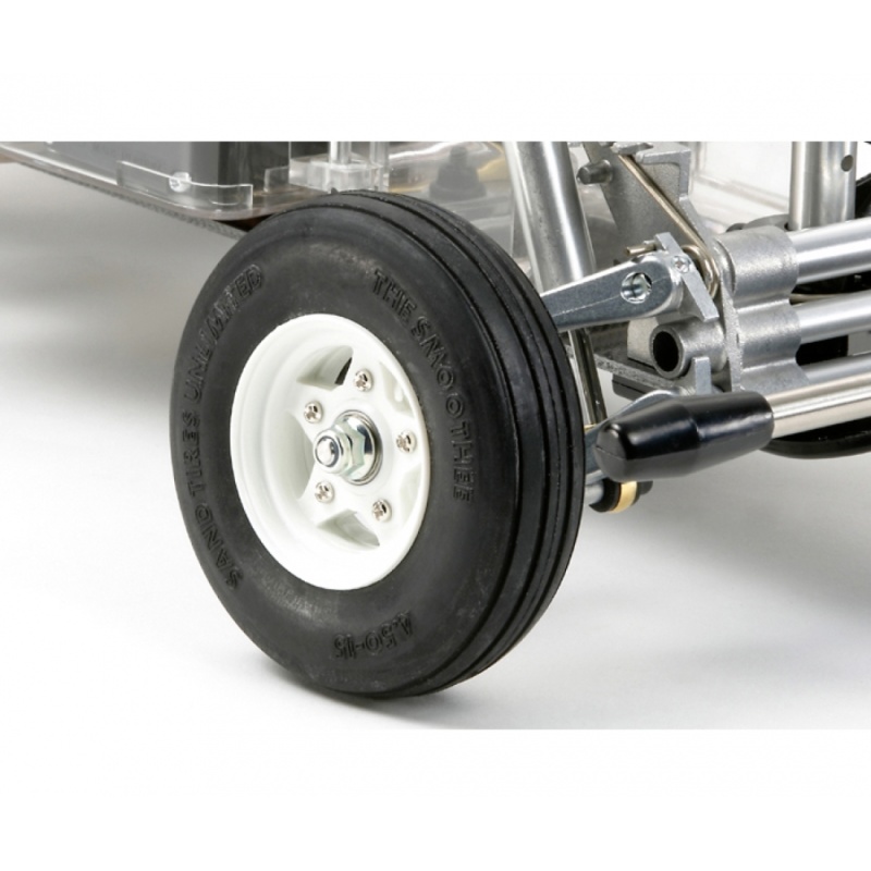 Chassis features a 2mm thick FRP plate with an aluminum reinforcing plate for strength and flexibility to ensure stability. 4-wheel independent suspension features front double trailing arm and rear swing axle setups, die-cast suspension arms, and oil dampers. Electronics and battery are protected by a durable clear plastic mechanism box. Comes equipped with full ball bearings to reduce friction loss, and mounted on the 3-piece center-lock wheels are grooved front tires and ribbed rear tires that ensure superb off-road performance.