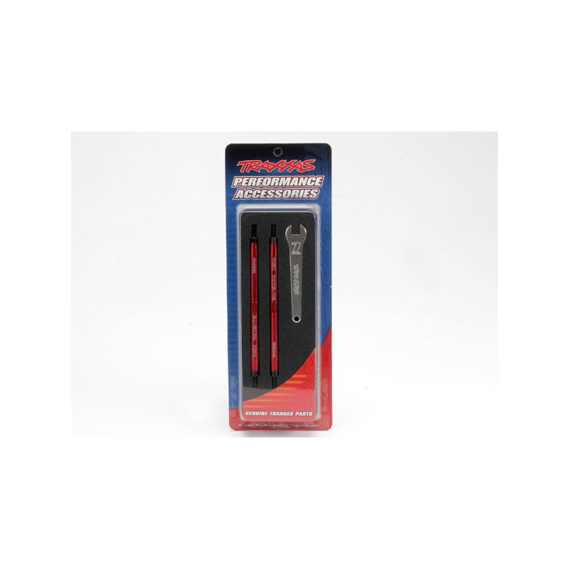 Lightweight Aluminum Turnbuckles 30% lighter than steel, more than double the strength of titanium! TUBES® add a high-tech stealth look to Revo and Maxx trucks. TUBES are 30% lighter than the stock steel toe links, plus they’re 4-times stiffer and more than double the strength of aftermarket titanium! These are the strongest toe links you can buy for your Maxx or Revo. The secret is in the unique hollow tube design that maximizes stiffness and resistance to bending, while at the same time reducing weight. The beefy size tells everyone your truck means business. Traxxas TUBES are manufactured from high-grade 7075-T6 aluminum and anodized in both carbon black and red. To prevent marring the finish, a metric aluminum wrench is included for adjustment. The broad center nut makes it easy to line up the wrench for fast, trackside tuning. A handy machined groove on one end easily identifies the left hand threads.