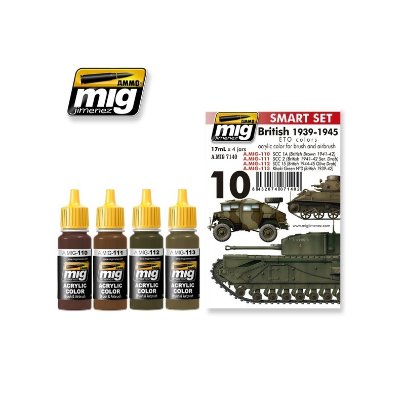 With this set the modeler can paint British vehicles, from 1939 to 1945 in the European Front (ETO), without hours of research or complex mixtures. From a Matilda Mk I to a late war Firefly, the modeler can find the right colors in this set. All paints are acrylic and are formulated for maximum performance both with brush or airbrush and will allow us to apply the correct color on our models. 4 jars 17 mL. Water soluble, odorless and non-toxic. Shake well before each use. Each jar includes a stainless steel agitator to facilitate mixture. We recommend MIG -2000 Acrylic Thinner for a correct thinning. Dries completely in 24 hours.