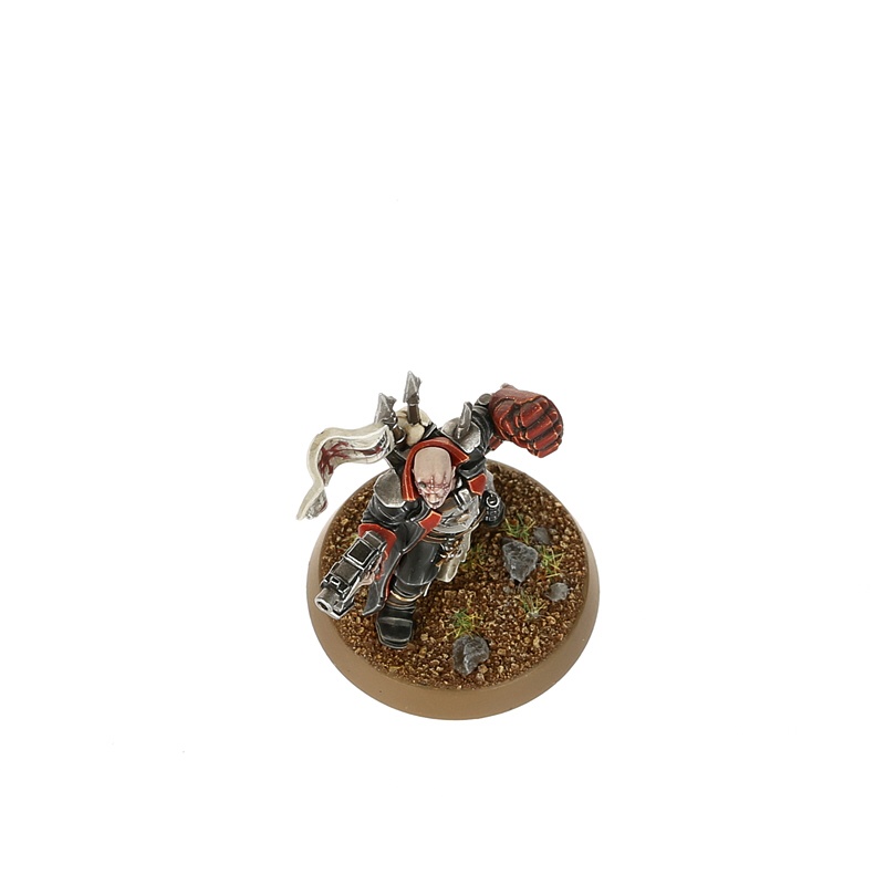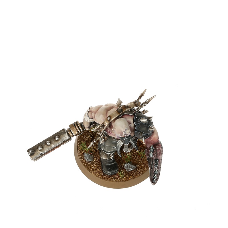 Enforcers are sadistic disciplinarians amongst the Militarum Traitoris, whether petty tyrants who killed their way to dominance, or former officers brought low through corruption. Some cement their position by exploiting savage Traitor Ogryns – crude line-breakers and added muscle – as living shields to help impose their violent rule.