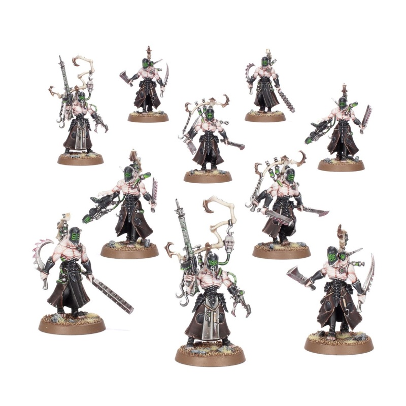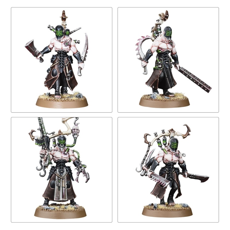 The Wracks can be equipped with a host of interchangeable weapons and equipment, including torturer's tools, two liquifier guns, two ossefactors, two hexrifles, two stinger pistols, masks, and backpacks. There are also parts to build an Acothyst who can additionally be armed with an agoniser, power weapon, or scissorhand.