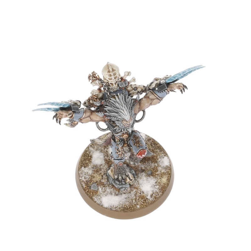 The Wulfen can be armed with a choice of thunder hammer and storm shield, great frost axe, or twin frost claws. Each miniature has a choice of two heads, and their backpacks can feature a stormfrag auto-launcher or death totem.