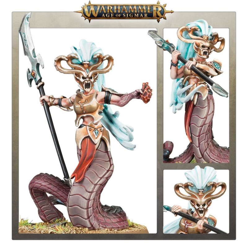 This multi-part plastic kit contains the components necessary to assemble 5 Blood Sisters. The first thing you’re likely to notice about these miniatures is their legs, or rather their lack – reshaped in the image of their creator Morathi, everything below their torso has been reshaped into that of a sinister, twisted serpent. Above the this they feature metal waist pieces with attached sashes, and armoured breastplates. The Blood Sisters feature intimidating full-face masks, each with expressions of fury and snakes framing their wild, swept-back hair. You have the option to build 1 model as a Gorgai, the unit leader: she can be distinguished by her uniquely jeweled mask, specific heartshard glaive and her grisly trophy – the heart of an unfortunate victim, clutched proudly in her left hand.