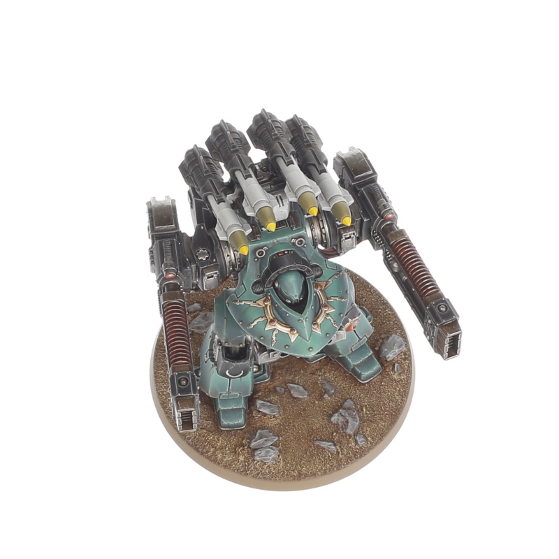 The Deredeo Dreadnought is a walking heavy weapons platform, designed to combine superior firepower with the flexibility and durability of a Dreadnought chassis. Though highly resource-intensive to produce and maintain, its undoubted survivability and killing power ensures the Deredeo is in high demand by Traitor and Loyalist Legions alike from the few Forge Worlds able to fashion them.