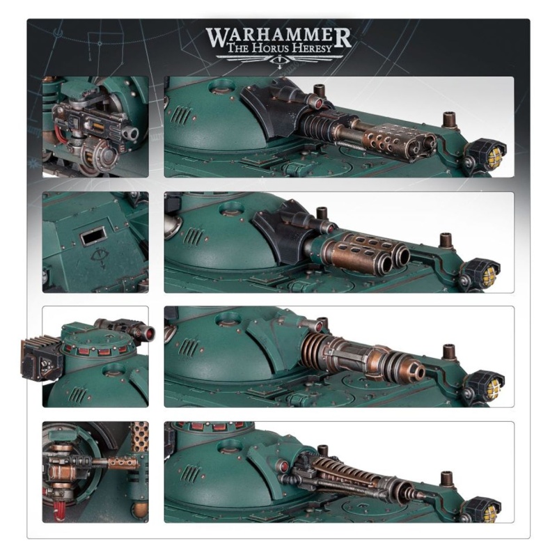 The kit also includes components to upgrade the Legion Predator with a pintle-mounted weapon – a havoc launcher, heavy bolter, heavy flamer, multi-melta, or a combi-weapon with five configurations (bolter, flamer, melta, plasma, or volkite) – as well as a searchlight, a dozer blade, a hunter-killer missile, and a number of cosmetic options, such as towing hooks, sigils, and a choice of a Space Marine gunner, spotter, or closed hatch.