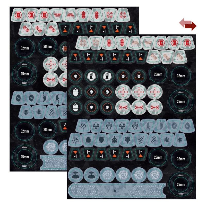 – Combined Token Sheet: Easily track abilities, objectives, equipment, and points throughout your games with team-themed tokens. The sheet contains 72x double-sided cardboard tokens – 38x for the XV26 Stealth Battlesuits kill team, and 34x for the Wolf Scouts kill team.