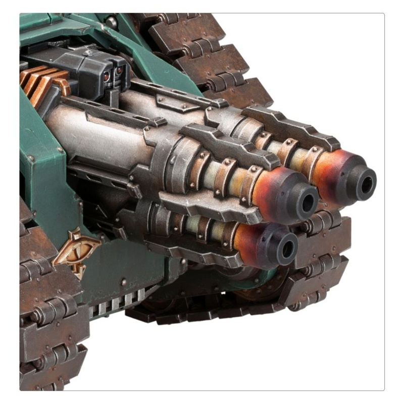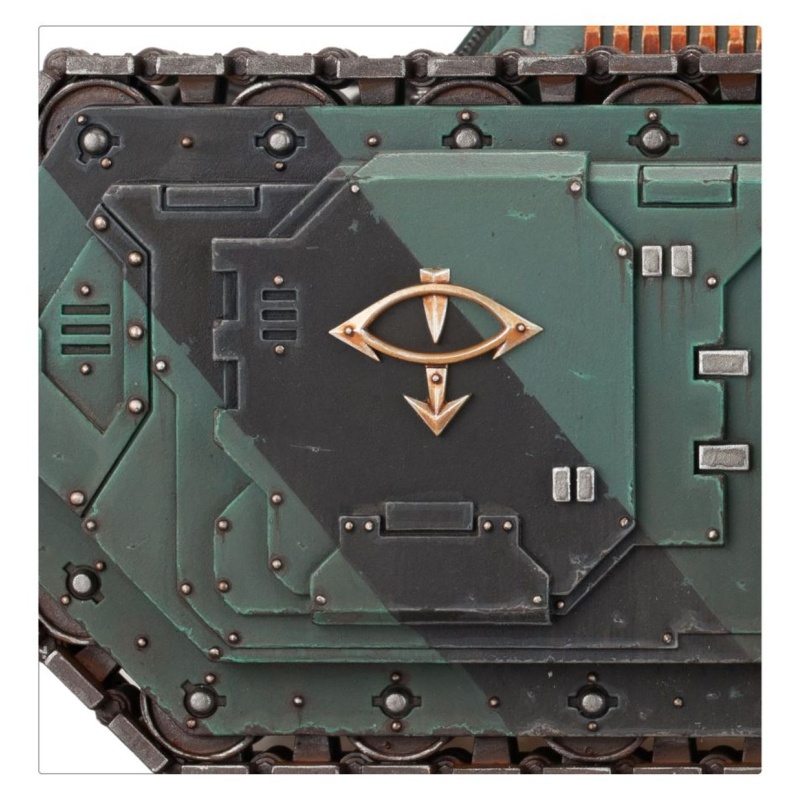 The Cerberus is a rare variant of the Spartan chassis that uses its massive hull to mount a prototype neutron laser projector, as well as the sizable arc-reactors and radiation shielding needed to operate the weapon. The neutron laser is poorly understood by the adepts of the Mechanicum, but stands among the most effective anti-tank weapons available to the Space Marine Legions, capable of punching through the strongest plating and shorting out its target’s systems with bursts of radiation. The terrible toll the Cerberus takes on its crew is regarded by many commanders as a necessary cost, for this impressive tank can threaten even Titan-class opponents.