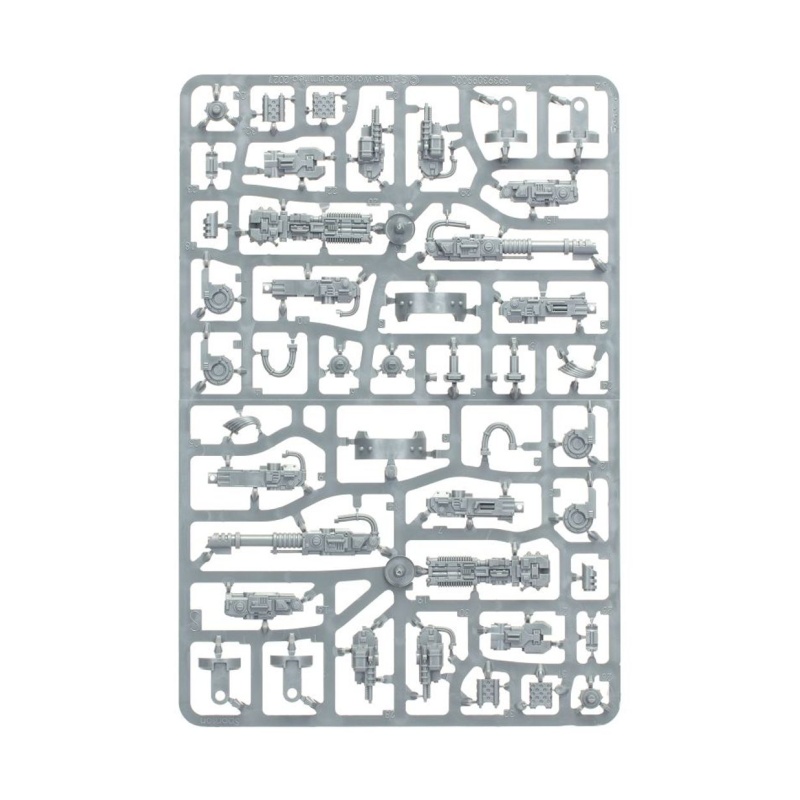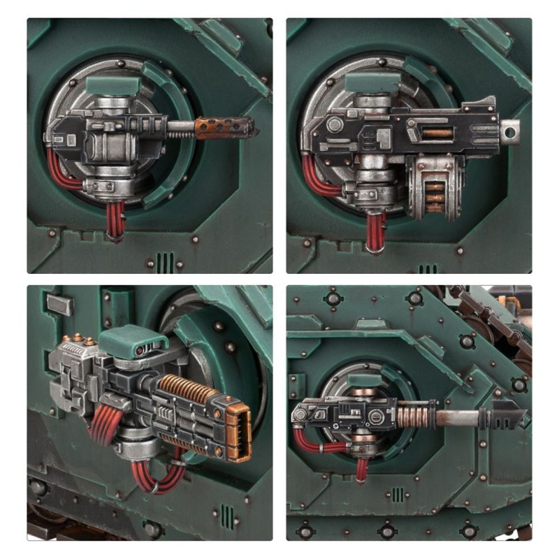 The kit also includes components to upgrade the Cerberus with a pintle-mounted weapon – a havoc launcher, heavy bolter, heavy flamer, multi-melta, or a combi-weapon with five configurations (bolter, flamer, melta, plasma, or volkite) – as well as a searchlight, a hunter-killer missile, and cosmetic options such as towing hooks, icons for Loyalists and Traitors, and a choice of a Space Marine gunner, spotter, or closed hatch.