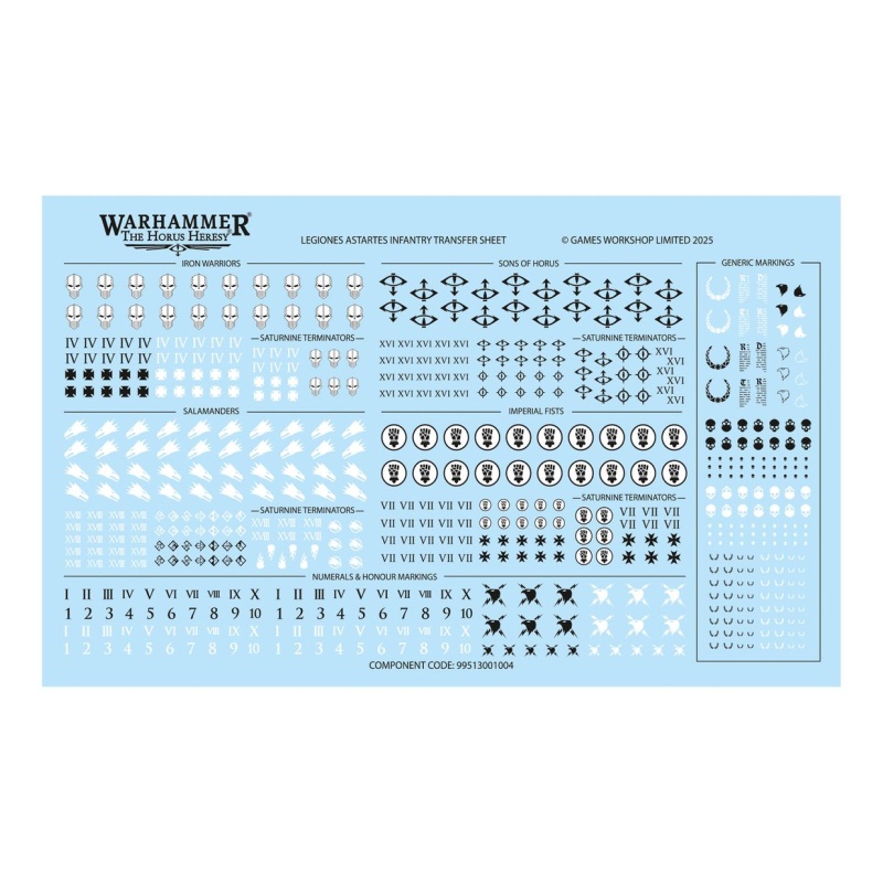 This kit comprises 344 plastic components, 20x Citadel 32mm Round Bases, and 1x Horus Heresy Legion Infantry Transfer Sheet containing 618 high-quality waterslide transfers – featuring Legion iconography for the Sons of Horus, Imperial Fists, Iron Warriors, and Salamanders – to decorate your miniatures.
