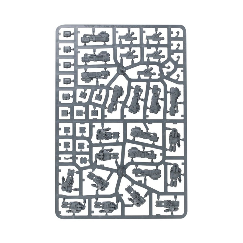 This plastic upgrade kit can be used to equip Legionaries from the MKVI Tactical Squad set with powerful heavy weapons, suitable for use in a Legion Heavy Support Squad. The kit includes 10 heavy flamers, 10 multi-meltas, and 10 shoulder-mounted plasma cannons, along with arms suited to each weapon, allowing you to upgrade up to three Heavy Support Squads of 10 models, or six units of five models. Also included are four augury scanners which can be carried alongside a heavy weapon, allowing your Heavy Support Squads to detect and eliminate enemy units.