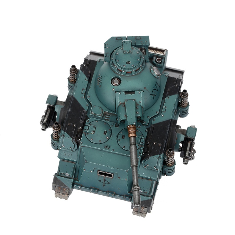 The Predator is perhaps the best known and most widespread variant of the basic Rhino chassis. Augmented with superior armour and firepower, it entirely sacrifices the Rhino’s troop transport capacity in favour of ammunition and generators for its formidable weapon systems. The result is an effective and versatile tank of the line, with an excellent balance of speed, firepower, and protection. The Predator's robust design can field a wide variety of armament configurations – the Legiones standard is a rapid-firing turret mounted autocannon, but other configurations include a powerful heavy lascannon, or more exotic grav and volkite weapons.