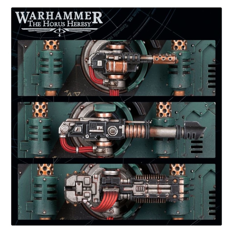 The kit also includes components to upgrade the Legion Predator with a pintle-mounted weapon – a havoc launcher, heavy bolter, heavy flamer, multi-melta, or a combi-weapon with five configurations (bolter, flamer, melta, plasma, or volkite) – as well as a searchlight, a dozer blade, a hunter-killer missile, and a number of cosmetic options, such as towing hooks, sigils, and a choice of a Space Marine gunner, spotter, or closed hatch.