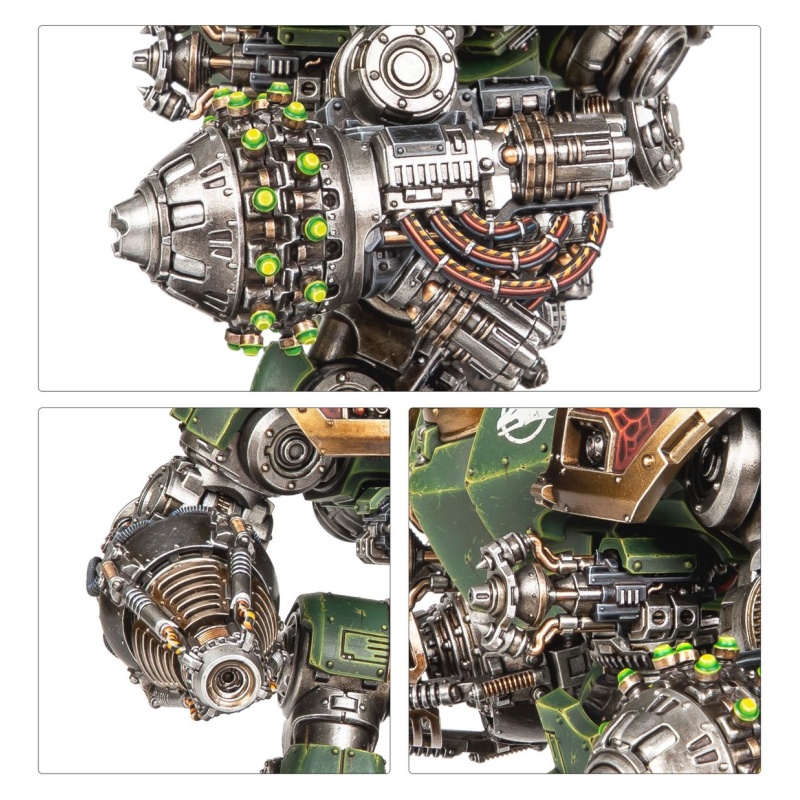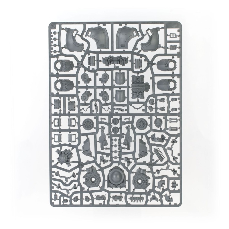 The kit includes four different sarcophagus options, including one Loyalist-themed and one Traitor-themed. Three sets of armour plating, head options, an optional halo, and two sets of leg trim make it easy to customise your mighty war machine.