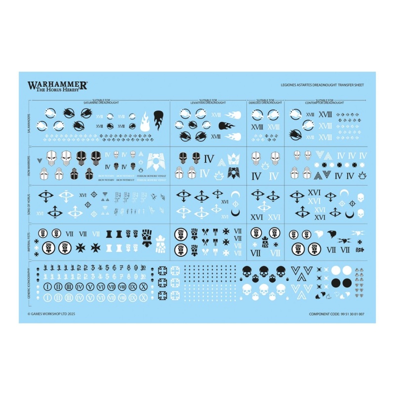 This kit comprises 213 plastic components, 1x Citadel 100mm Round Base, and 1x Horus Heresy Dreadnought Transfer Sheet containing 528 high-quality waterslide transfers – featuring Legion iconography for the Sons of Horus, Imperial Fists, Iron Warriors, and Salamanders – to decorate your miniatures.