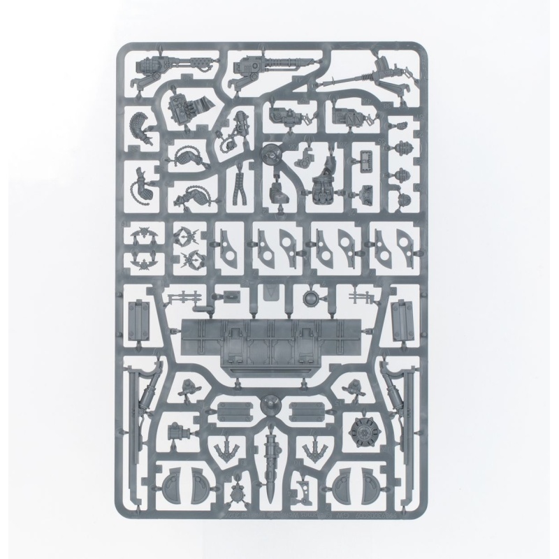 The tank's forward hatch can be assembled with closed doors, or opened for a Solar Auxilia spotter or gunner with a pintle-mounted weapon – a heavy flamer, multi-laser, or heavy stubber. The kit includes components to upgrade your Basilisk or Medusa with a hunter-killer missile and dozer blade, and you'll also find cosmetic options such as sigils and a choice of gunner heads.