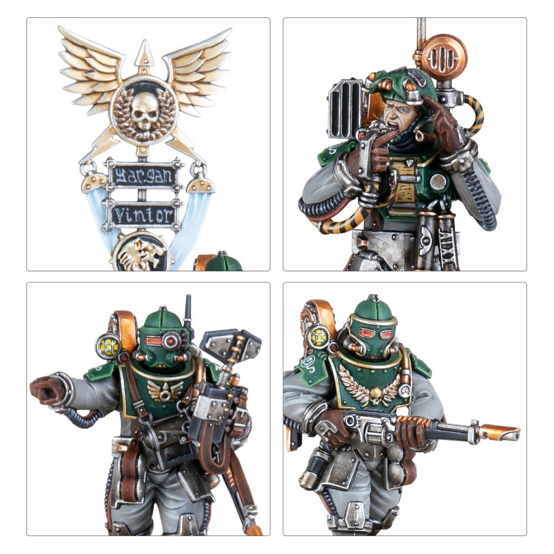 This multipart plastic kit builds a Solar Auxilia Tactical Command Section, comprising one Auxilia Captain and four Auxilia Companions. These soldiers are clad in finely decorated void armour, and carry command gear alongside their lasrifles – the kit includes an augury scanner, a command vox, and a proud cohorts vexilla, as well as a lethal melta bomb. The Captain comes with a choice of heads, and loads of extra weaponry – a power fist, power sword, or charnabal sword, as well as a laspistol, blast pistol, needle pistol, plasma pistol, or hand flamer.