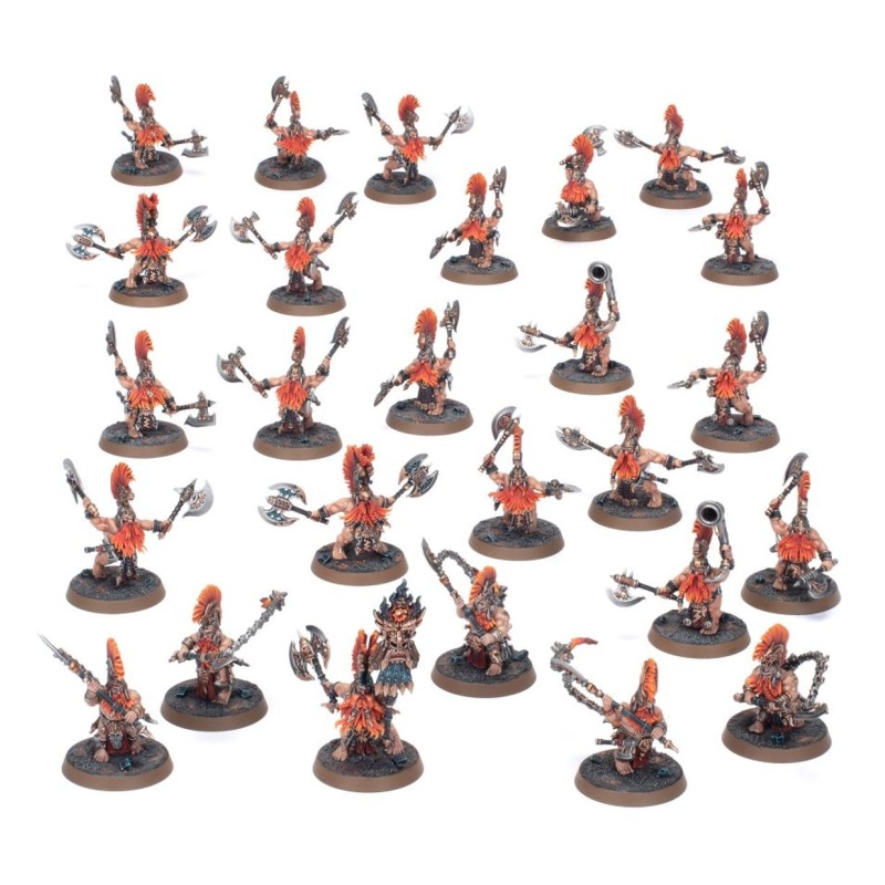 The lives of the Fyreslayers revolve around battle, for these grizzled duardin mercenaries will fight on behalf of any who meet their price in gold. Renowned for their fearsome tempers and unrivalled martial skills, the Fyreslayers seek treasure to gather the essence of their long-lost deity, Grimnir. Inspired by Battlesmiths bellowing the deeds of their forebears, stalwart Hearthguard warriors and unyielding Vulkite Berzerkers charge into battle, craving glory and gold alike.